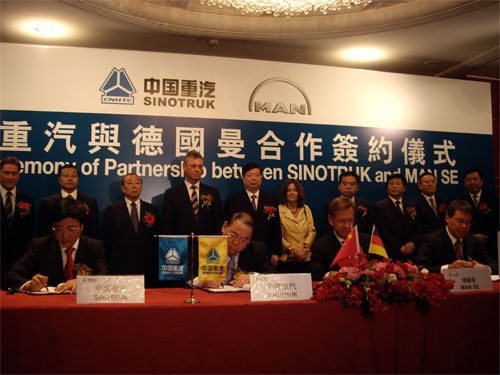 2009年10月12日,中國重汽在濟(jì)南宣布雙方合作已經(jīng)進(jìn)入實(shí)質(zhì)階段,協(xié)議以中國重汽控股51%、德國曼公司斥資5.6億歐元(約60.48億港元)入股中國重汽25%+1股,同時(shí)以獨(dú)占許可的方式將包括整車以及歐Ⅲ、歐Ⅳ和歐Ⅴ發(fā)動(dòng)機(jī)等在內(nèi)的技術(shù),在中國境內(nèi)授權(quán)于中國重汽及相關(guān)下屬公司。