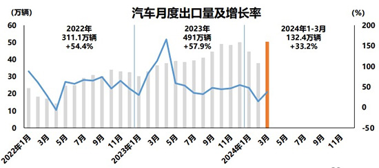 在新能源車的帶動(dòng)下,我國(guó)汽車出口整體表現(xiàn)搶眼,3月出口量達(dá)50.2萬輛,同環(huán)比增速均超過30%;一季度累計(jì)出口132.4萬輛,同比增長(zhǎng)33.2%。分車型看,一季度乘用車出口111萬輛,同比增長(zhǎng)34.3%;商用車出口21.4萬輛,同比增長(zhǎng)27.5%。