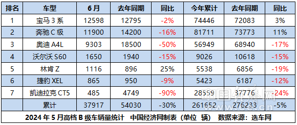 高檔B級車方面,大部分車型的銷量均出現(xiàn)一定程度的下滑。具體來看,寶馬3系雖然以12598輛的成績奪得6月月度銷冠,但同比卻下降2%;奔馳C級和奧迪A4L的單月銷量分別為11900輛、9303輛,同比分別下降16%、50%。