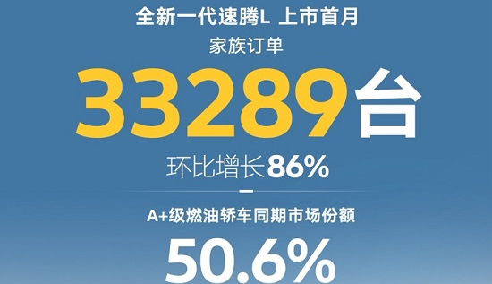 一汽-大眾發(fā)布數(shù)據(jù)顯示,全新一代速騰L上市首月,速騰家族銷量達(dá)33289輛,環(huán)比增長86%,占據(jù)A+級燃油轎車同期市場份額50.6%,創(chuàng)歷史新高。