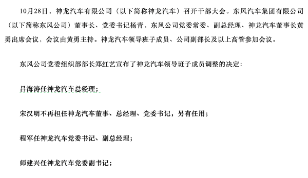 10月28日,神龍汽車有限公司召開干部大會,并宣布了涉及共計(jì)5人的公司領(lǐng)導(dǎo)班子成員調(diào)整:呂海濤任神龍汽車總經(jīng)理;宋漢明不再擔(dān)任神龍汽...